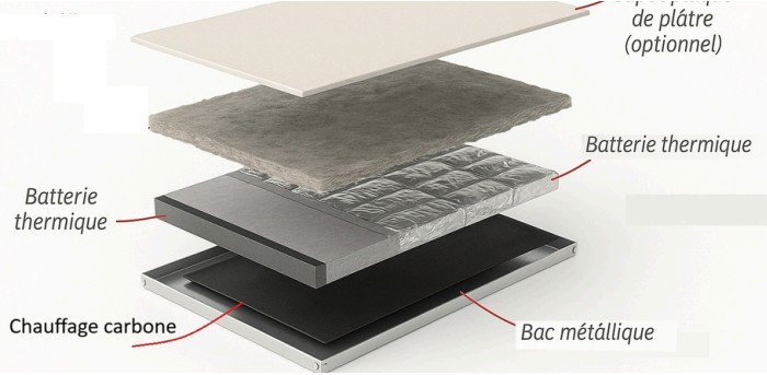 • HeatWarmStor associe ces deux technologies dans un même panneau. Cette solution hybride combine chauffage rayonnant et stockage thermique intégré. Elle existe en version Carbone ou Aqua, compatible avec les réseaux hydrauliques.
